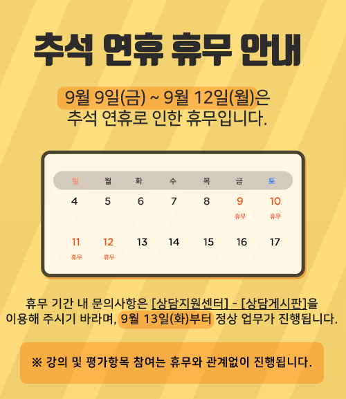 이전글 2022년 2-3기(8/4 개강) 중간고사 일정 안내