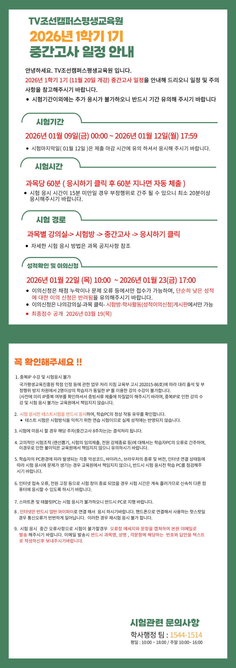 제목 2026년 1-1기(11/20 개강) 중간고사 일정 안내