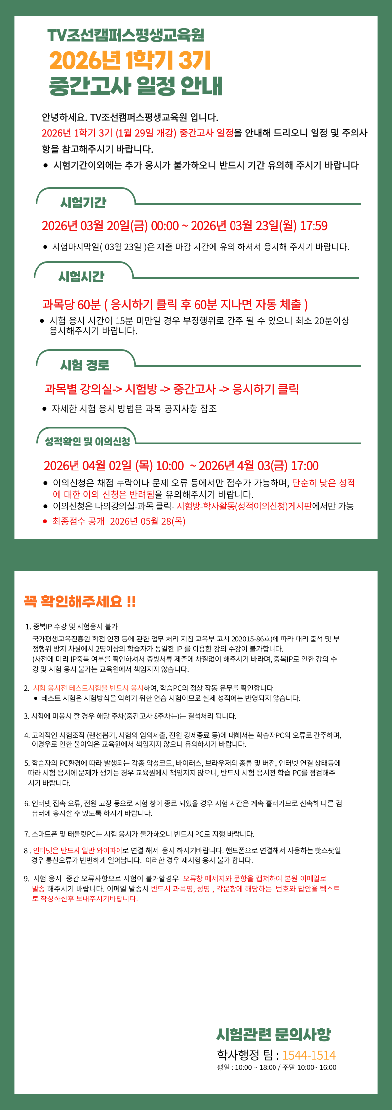 제목 2026년 1-3기(1/29 개강) 중간고사 일정 안내