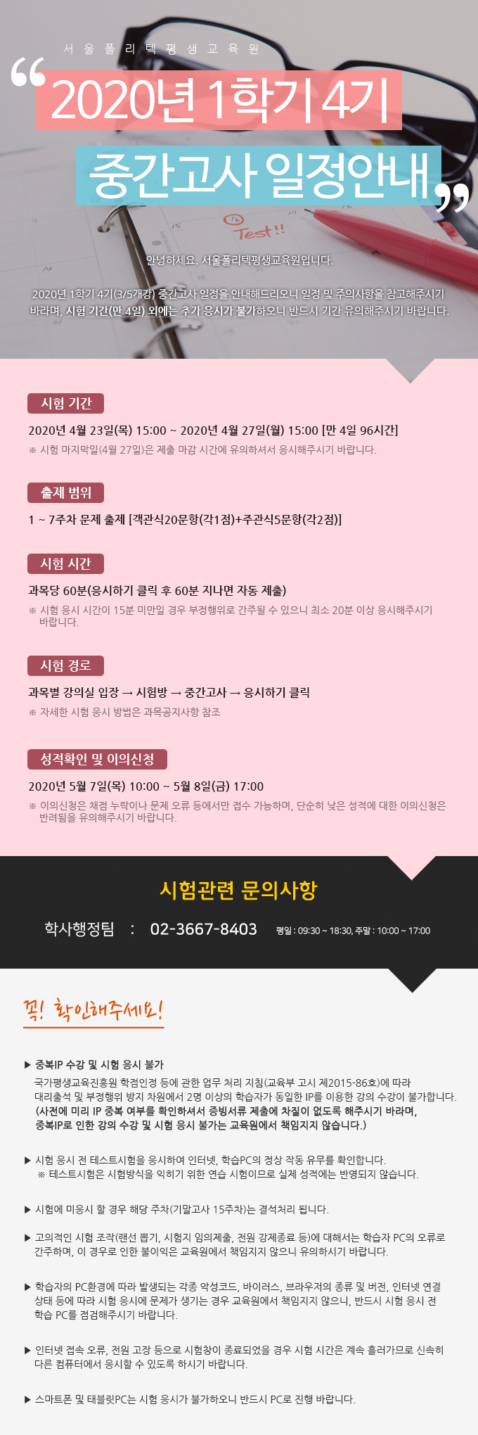 제목 2020년 1-4기(3/5개강) 중간고사 시험 일정안내
